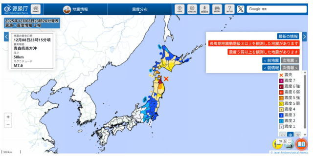 强震感主要集中在青森县,八户市震度达6强。北海道、岩手县、宫城县等地也有显著震感。青森县内目前已报告了数起建筑倒塌及火灾事件。进一步灾害情况还在统计中。
