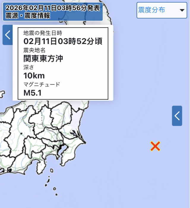 2月11日03:52(东京时间),日本关东东方冲(北纬35.6度,东经143.9度)发生了M5.1级地震,震源深度约10公里。