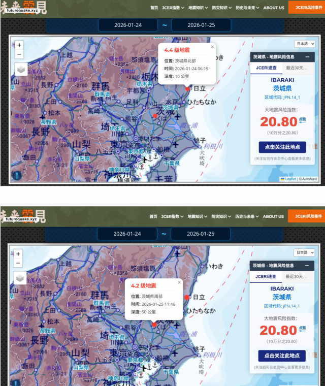 日本茨城县东京时间1月24日6:19和1月25日11:46分别发生4.4和4.2级地震,最大震度分别为4和3。